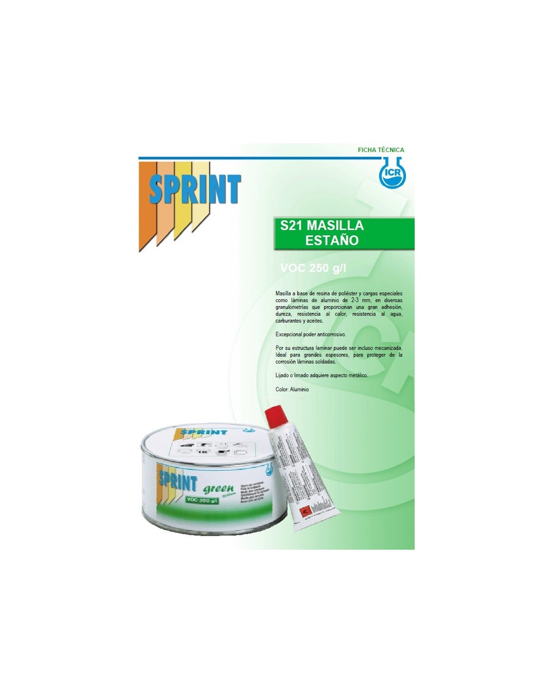 - Masilla a base de resina de poliéster y cargas especiales como láminas de aluminio de 2-3 mm, en diversas granulometrías, que proporcionan una gran adhesión, dureza, resistencia al calor, resistencia al agua, carburantes y aceites. Excepcional poder anticorrosivo. Por su estructura laminar puede ser incluso mecanizada. Ideal para grandes espesores, para proteger de la corrosión láminas soldadas. Lijado o limado adquiere aspecto metálico.